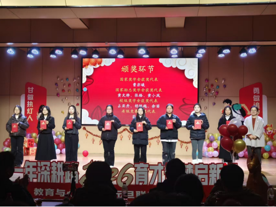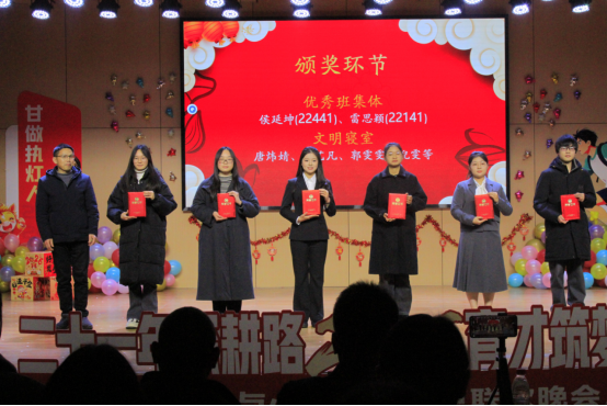 学院的发展离不开每一位师生的辛勤付出与卓越贡献。颁奖环节中,学院对过去一年涌现出的优秀集体和先进个人进行了隆重表彰。一张张荣誉证书,一份份沉甸甸的肯定,既是对他们努力与才华的褒奖,更是对全院师生的激励与鼓舞。学院副院长肖海平、王玉花,党委副书记于飞飞作为嘉宾为大家颁奖并合影留念,现场掌声雷动,荣耀与自豪洋溢在每一位获奖者的脸上。